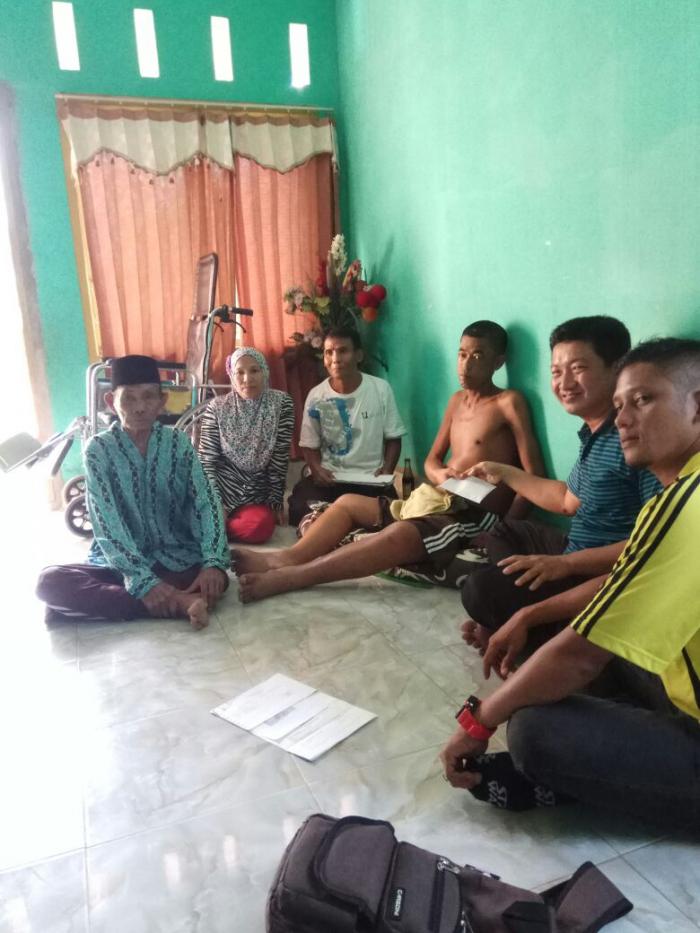 Yulianto bersama Fadli mewakili Pengurus Laskar Muda Hanura menyerahkan bantuan kepada Zulfan Heri yang didampingi istrinya Rozita Wati dan Ketua RT 01 Muhammad Harun, Senin (21/8/2017).(fen/der)