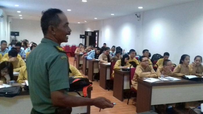 60an siswa - siswi sekolah Budha Kabupaten Bengkalis tengah serius menerima materi Wawasan Kebangsaan tentang menjaga persatuan dan kesatuan bangsa dari Pasi Ops Kodim 0303/Bkls Kapten Inf Sagino.(der/fen)