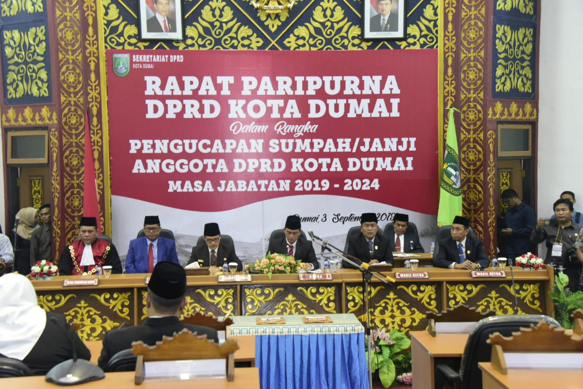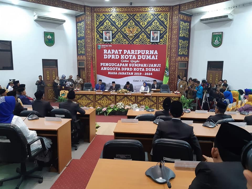 Rapat Paripurna dalam rangka Pengucapan Sumpah/Janji Anggota DPRD Kota Dumai masa jabatan 2019-2024 dipimpin Ketua DPRD Dumai Gusri Effendy, Idrus ST, Zainal Abidin serta dihadiri Walikota Dumai Zulkifli AS, Wakil Walikota Dumai, Eko Suharjo dan segenap Forkompinda Dumai serta anggota DPRD Dumai Periode 2014-2019.