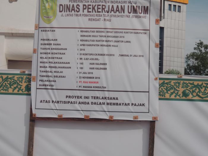 INHU,(Porosriau.Com) - Gawat Untuk rehab Gedung Kantor Bupati Indragiri Hulu (Inhu) yang pernah terbakar beberapa tahun silam itu saja menelan dana APBD TA 2016 Saat ini lebih Rp.2,6 Miliar.ttepatnya di jalan lintas timur pematang reba kecamatan rengat barat kab inhu.