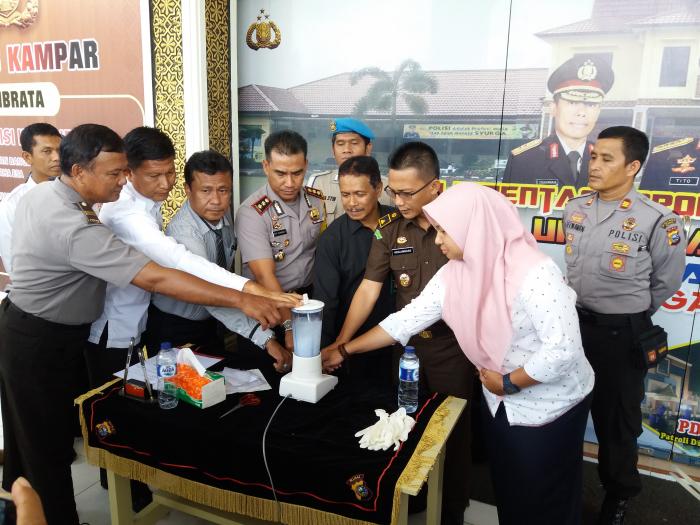 Narkotika yang dimusnahkan kali ini berasal dari 2 ungkap kasus oleh Satuan Reserse Narkoba Polres Kampar yaitu pada tanggal (22/3/2017) dengan tersangka PU (Pr 16) diwilayah Perhentian Raja dengan barang bukti 24,08 gram shabu-shabu, dan satu kasus lainnya pada tanggal (27/3/2017) dengan tersangka RB (Lk 35) di Jalan Lintas Riau - Sumbar wilayah Air Tiris dengan barang bukti 10,08 gram shabu-shabu. Pada Rabu 29 Maret 2017 pukul 10.00 wib,
