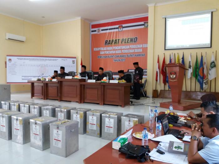 Rapat Pleno ini dipimpin Ketua KPUD Kampar Yatarullah Sag, SH, Mhum dan dihadiri semua komisioner KPUD Kampar, Ketua Panwaslu Kampar Martunus Sag beserta Pimpinan Paswaslu Kampar, Anggota Bawaslu Riau Rusdi Rusydan Sag, PPK se-Kab. Kampar dan para saksi dari perwakilan ke-5 Paslon.