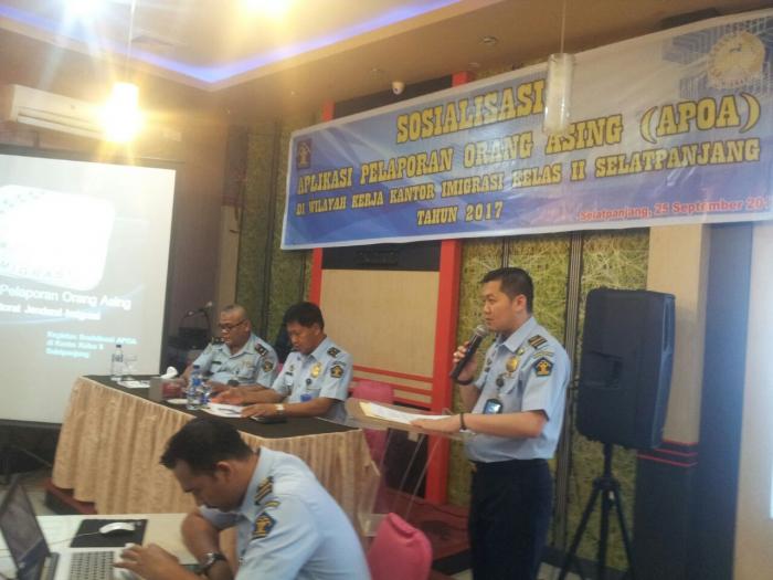 SELATPANJANG(POROSRIAU.COM) – Kantor Imigrasi Kelas II Selatpanjang gelar acara Sosialisasi Aplikasi Pelaporan Orang Asing (APOA) Tahun 2017 di Ballrom Copytiam dan Restro, Senin (25/9) Pagi, diikuti 60 peserta.
