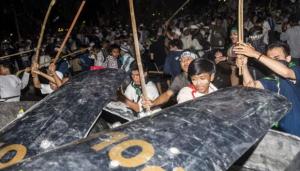 Beberapa dentuman gas air mata serta tembakan peringatan nampak dilepaskan melalui senjata milik polisi. Sementara itu, kendaraan baracuda atau antihuru-hara juga dikerahkan untuk membubarkan kerumunan massa.