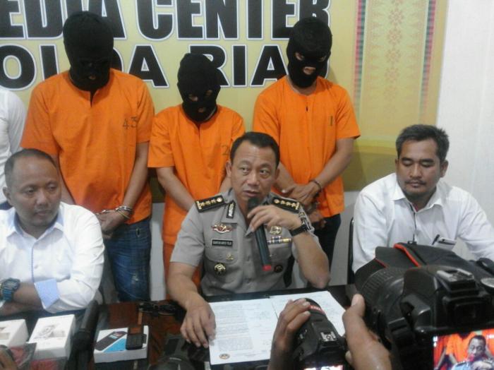 Dalam Konperensi Pers siang ini, Kabid Humas Polda Riau, Kombes Pol Guntur Aryo Tejo, SIK,MM mengatakan bahwa aparat Reskrimum berhasil menangkap ketiga tersangka ini di tiga tempat terpisah hari selasa lalu, diataranya di Bandara Hang Nadim Batam Aparat Reskrimsus Polda Riau menangkap tersangka DMS. Selanjutnya aparat berturut turut menangkap tersangka ANS di jalan Seroja Indah Harapan Raya Pekanbaru dan tersangka DD ditangkap di Jalan Pelangi Medan Sumatera Utara.
