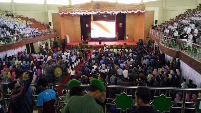 Terlihat ribuan peserta yang terdiri dari pelajar, mahsiswa bakan masyarakat di sekitar kampus, turut memadari aula gedung PKM UIN Suska Riau, Rabu (5/4) hingga melebar ke luar gedung.