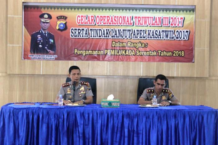 PANGKALAN KERINCI(POROSRIAU.COM)- Dalam mengukur hasil kerja dan keberhasilan personil Polres Pelalawan sebagai pelayan masyarakat di bidang penegak hukum di wilayahnya. AKBP Kaswandi Irwan SIk menggelar Operasional (GO) triwulan III di Aula Teluk Meranti Polres Pelalawan, Senin Pagi (20/11/17).