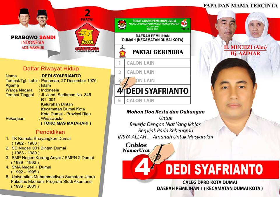 Dedi Syafrianto, salah seorang Caleg Dapil 1 Kota Dumai, yang awalnya tidak diperhitungkan baik lawan politik maupun masyarakat, akhir akhir dipenghujung waktu mencuat drastis bak kuda hitam yang terus mengalir dukungan masyarakat kepadanya.