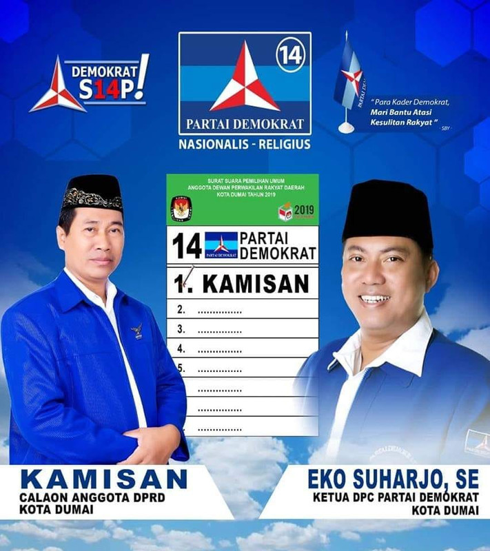 Beliau adalah Kamisan, Caleg yang mendapat nomor urut 1 ini optimis Partai Demokrat mendapat jatah kursi pada perhelatan kontestasi 17 April 2019 nanti. Sebagai seorang sosok andalan dari Demokrat Dapil III ini, beliau mengharapkan kepada seluruh Caleg Dapil III Partai Demokrat agar bersama sama bekerja keras dan optimis pada kontestasi Pileg 2019 ini.