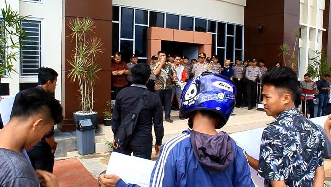 Dengan pengawalan ketat pihak kepolisian dan Satpol PP Rokan Hulu, aksi mahasiswa itu disambut langsung oleh Ketua PN Pasir Pengaraian Sarudi, SH bersama pengawai PN Pasir Pengaraian lainnya.