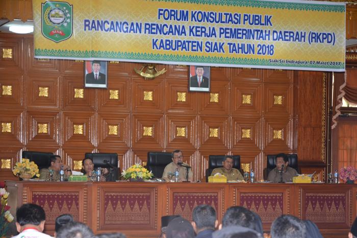 Bupati Siak Drs H Syamsuar M.Si mengatakan, berkaitan dengan Forum Konsultasi publik 2018 sangat perlu masukan yang sangat berarti, yang nantinya akan disusun sesuai dengan visi dan misi Kabupaten Siak untuk menjadi acuan kedepan yang harus di capai dengan prioritas pembangunan.Penyusunan RKPD diamanatkan pada peraturan yakni tata cara penyusunan dan evaluasi pelaksanaan rencana pembangunan daerah, tujuannya jelas untuk penyempurnaan rencana Daerah,kata Syamsuar.