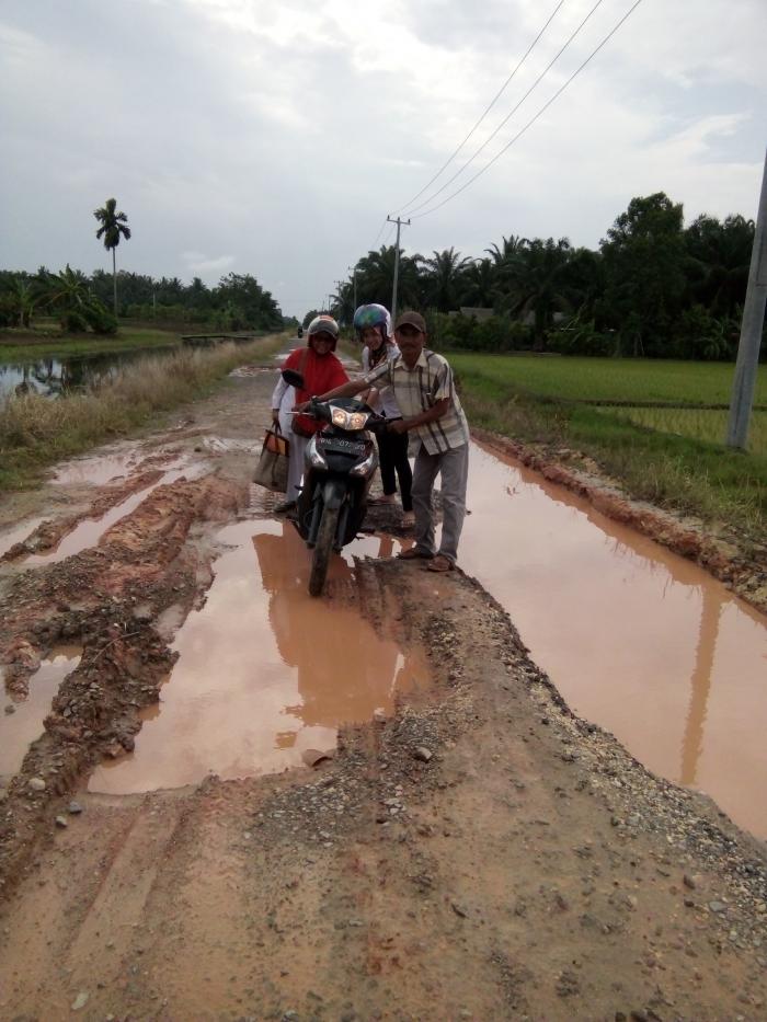 "Jalan di dusun Srimersing ini sudah lama rusak parah seperti ini, namun pemkab Siak kayaknya gak open. Padahal, ini merupakan akses jalan satu-satunya yang ada di dusun Srimersing," kata Rakip sembari memperlihatkan kondisi jalan yang rusak parah.